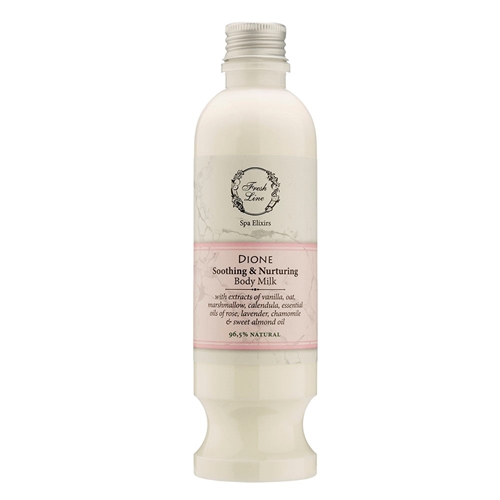 Prigrlite nježnost uz Dione — mlijeko za tijelo s baršunastom teksturom koje duboko hidratizira kožu i obnavlja njezinu prirodnu ravnotežu. Njegov, nježan miris koji spaja latice ruže, slatku vaniliju i mošus stvara umirujuću  atmosferu.