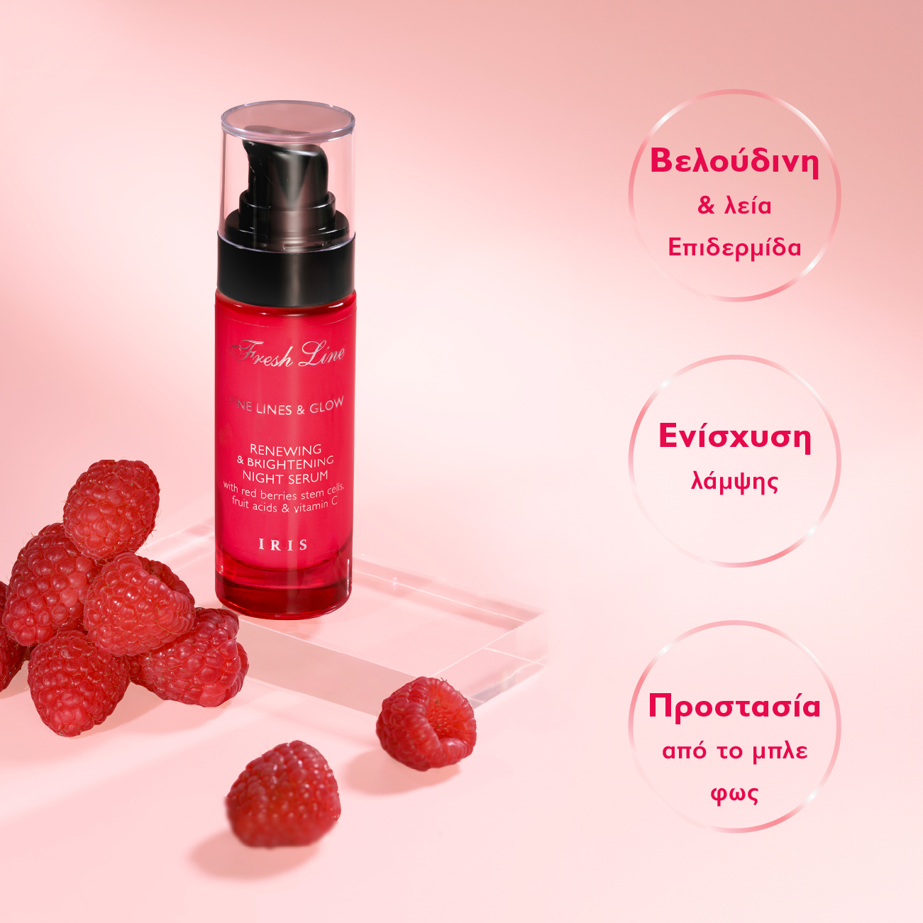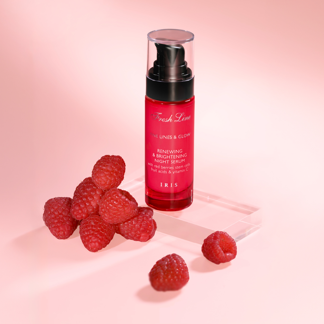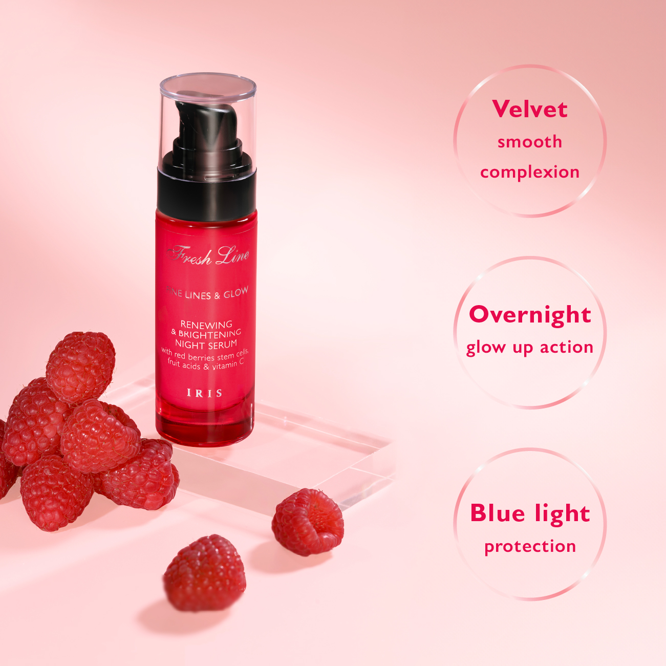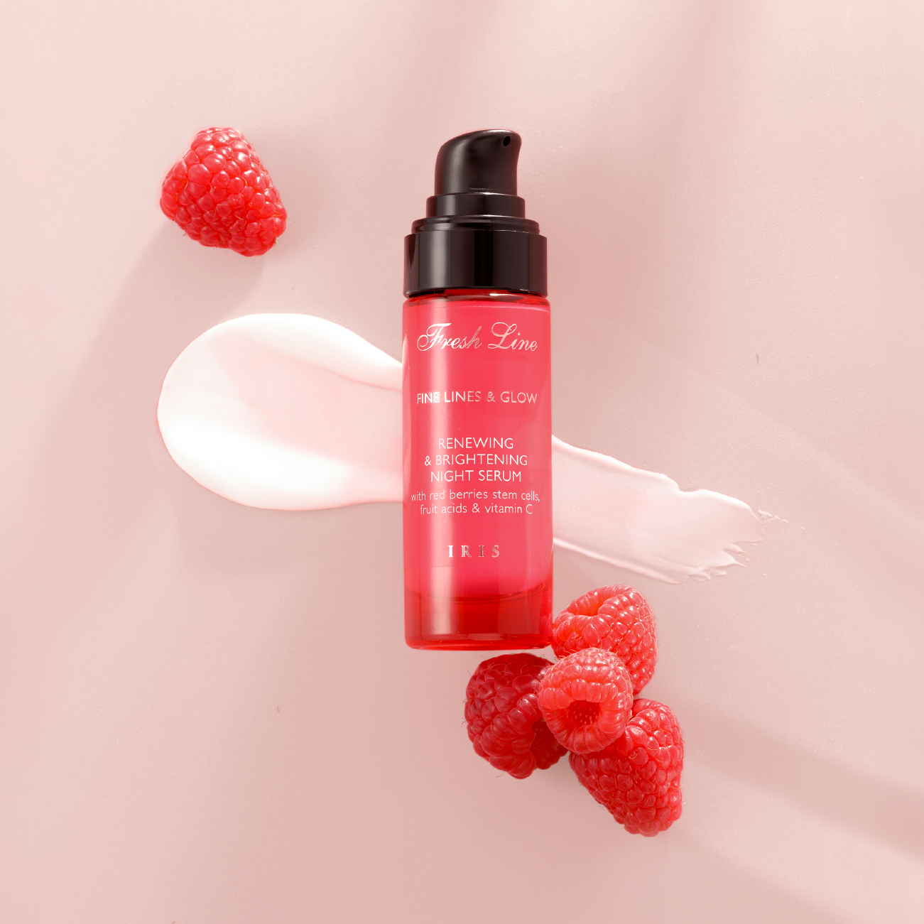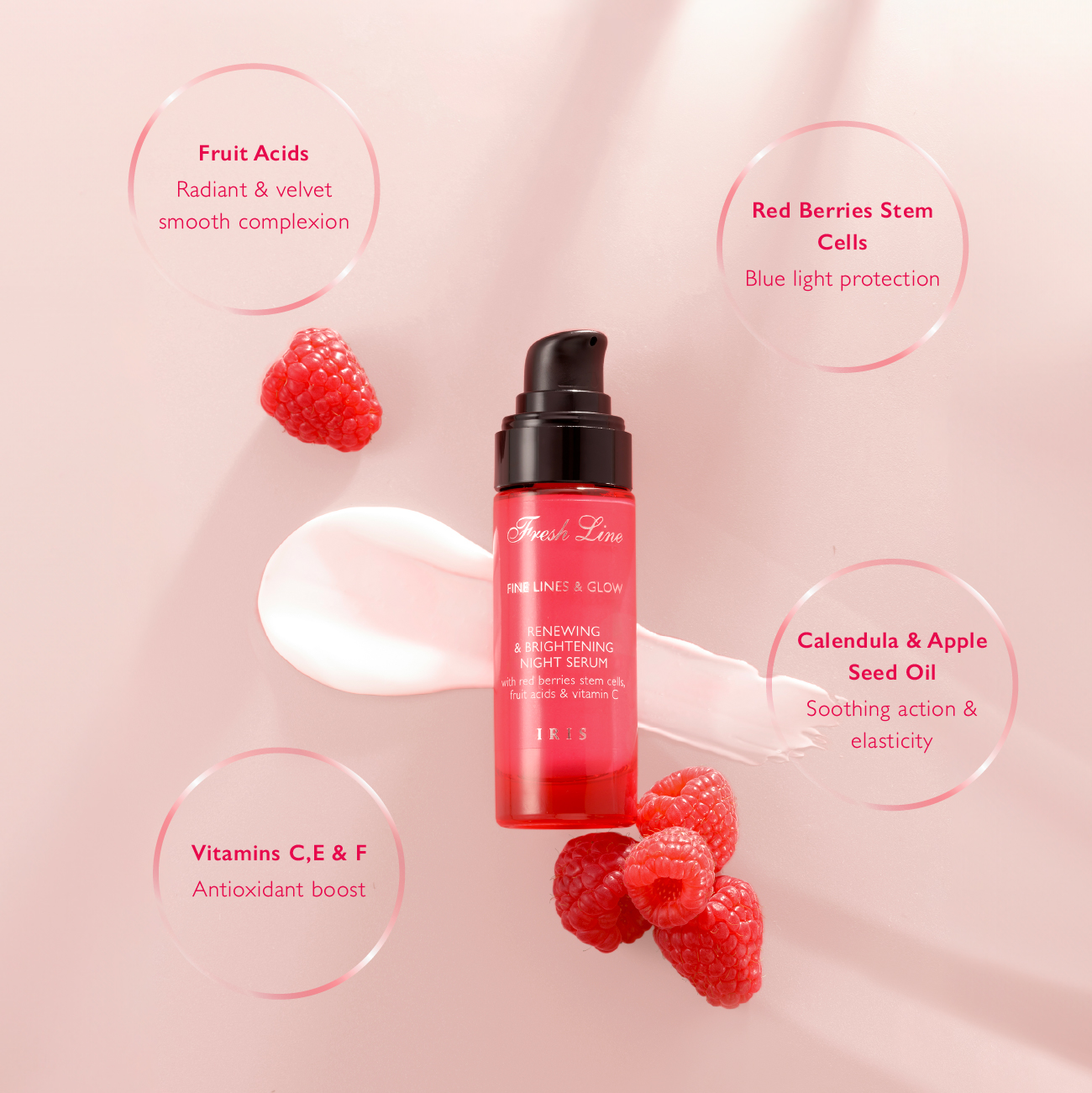 Osvježite svoju kožu tokom noći s Iris Noćnim Serumom! Luksuzna mješavina matičnih stanica crvenih bobica, voćnih kiselina i vitamina C koja potiče staničnu obnovu, otkrivajući svjetliji, glađi i blistaviji ten do jutra.